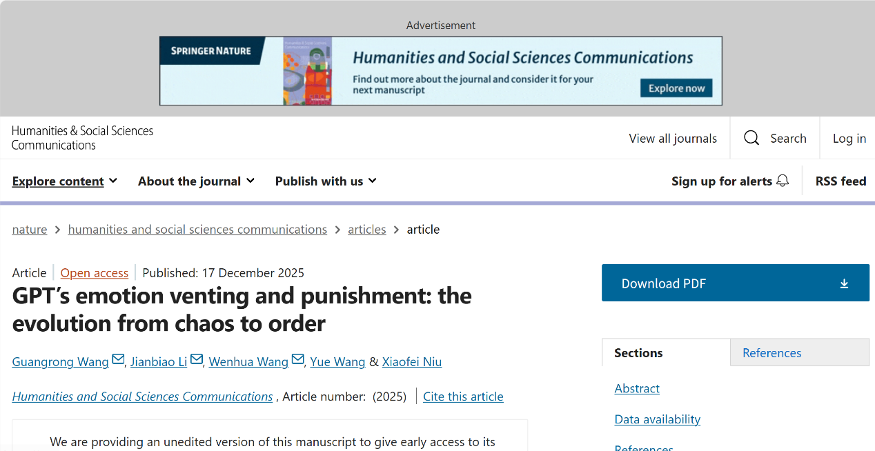近日,350vip浦京集团、350vip浦京集团类脑经济学研究中心李建标教授团队合作研究——AI情绪发泄——又有新突破,研究论文“GPT’s emotion venting and punishment: the evolution from chaos to order”已在线发表于Nature子刊Humanities & Social Sciences Communications(中科院人文科学1区)。该论文由潍坊学院王光荣教授,350vip浦京集团李建标教授、王文华博士后、王粤博士生和牛晓飞教授合作完成。